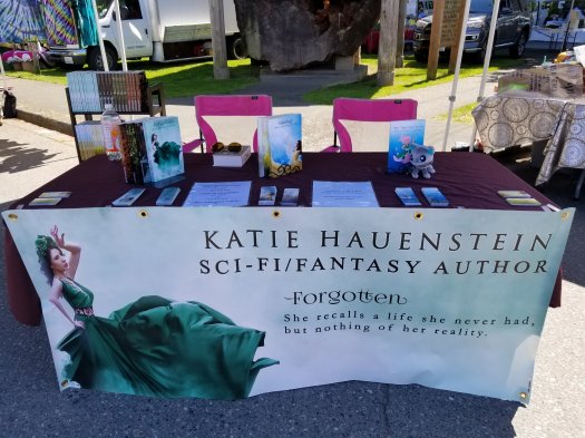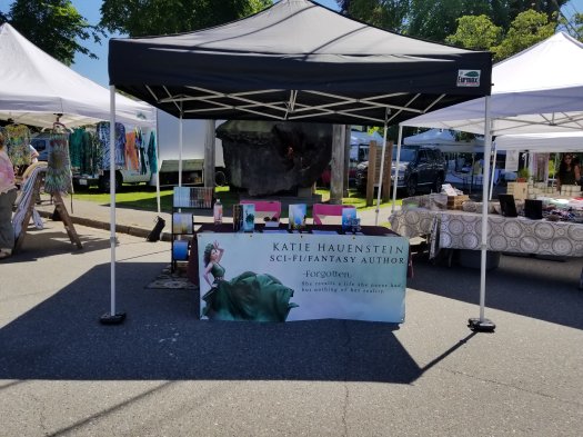 In the main row at the Snohomish Farmers Market today. If you’re hoping to catch me here this summer, come today. I won’t be back until July! Between Grain Bakery (I want to eat some of that peanut butter cake, for real) and a fruit stand with some tempting-looking cherries in front of it.